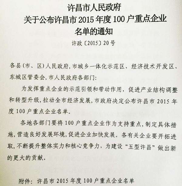 本次入圍,是市政府對公司為許昌市社會、經(jīng)濟發(fā)展所做貢獻的肯定,同時也為許昌公司2015年發(fā)展提供了良好的政策環(huán)境。