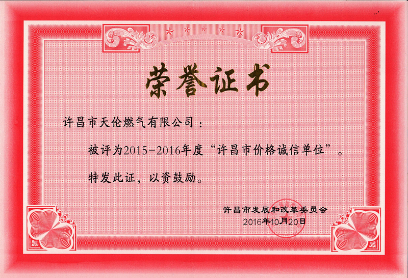 2017年2月8日,許昌市天倫燃?xì)庥邢薰颈辉S昌市發(fā)展和改革委員會(huì)授予了“2015-2016年度許昌市價(jià)格誠(chéng)信單位”榮譽(yù)稱號(hào)。