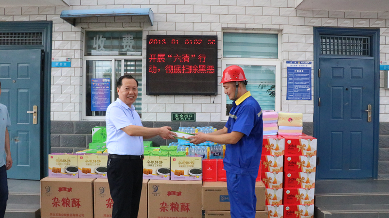 8月12日上午,許昌市總工會黨組書記、常務副主席羅世崗,市總工會辦公室主任吳超等領導一行,看望慰問了許昌天倫燃氣高溫酷暑下堅守工作崗位的一線員工,為大家送去了綠茶、礦泉水、毛巾等防暑降溫物品,許昌天倫燃氣總經理吳孟軍、副總經理喬朝輝等熱情接待。