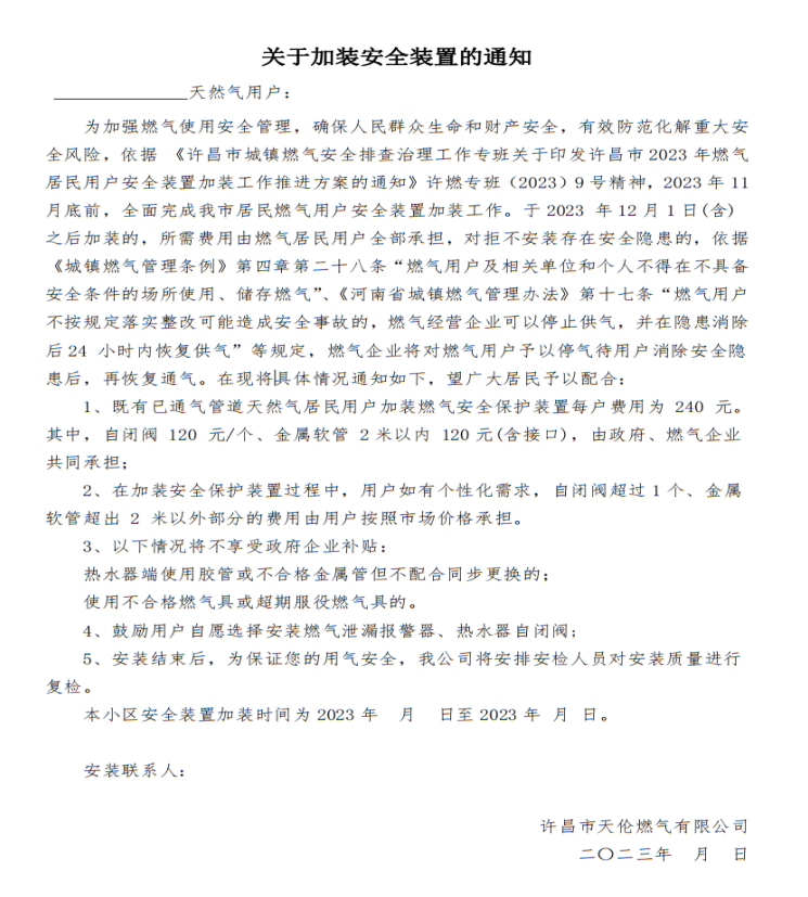 許昌市天倫燃氣居民用戶加裝安全裝置告知書